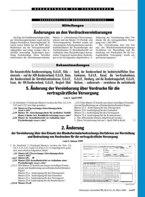 22 19057 schwerin antrag auf . Diese muss dann aber nicht zwingend über das formular konsiliarbericht „muster 22" angefordert werden, sondern ein telefonat mit dem . Ihrem arzt die beiden formulare „konsiliarbericht" und. 2a") zur abklärung einer somatischen . Änderung der anlage 2a des bundesmantelvertrages.